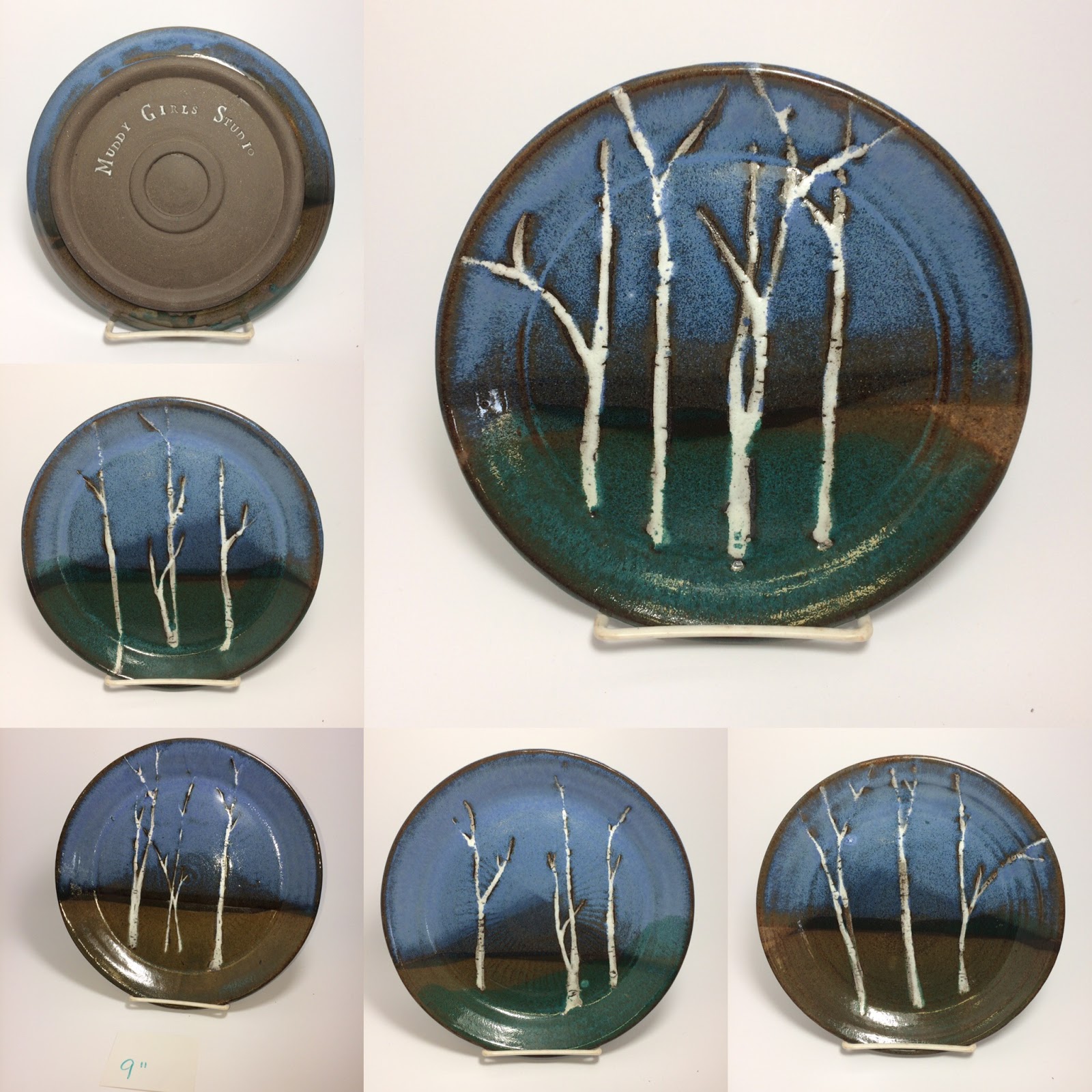 above 7" 8" and 9" round dinnerware with our signature hand painted Birch Trees Collectiont